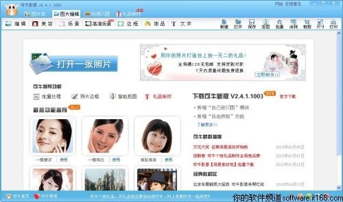 [导读]可牛影像新版本新增“自己做闪图”模块、自由拼贴功能,喜欢做修改图片的朋友可以快速做出精美图片。 可牛影像是新一代的图片处理软件,独有强大的照片场景功能,可快速制作出精美的婚纱照、明星照、日历、宝宝照、QQ头像、非主流闪图等,功能简单方便。 近日,可牛影像推出了v2.4.1.1003新版本,新增“自己做闪图”模块、自由拼贴功能,尤其闪图功能更加完善。