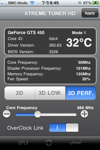 PC平台则需要安装最新版本的XTREME TUNER HD,开启“iPhone Control”功能,并设定相应的密码即可。 打开进入EXTREME TUNER HD的主界面,程序会自动侦测显卡的核心型号、温度、驱动版本、BIOS版本以及频率等各项基本信息。 在主界面中还为用户提供了“2D”、“3D LOW”和“3D PERF.”模式下的频率设定,并可手动调节风扇转速。