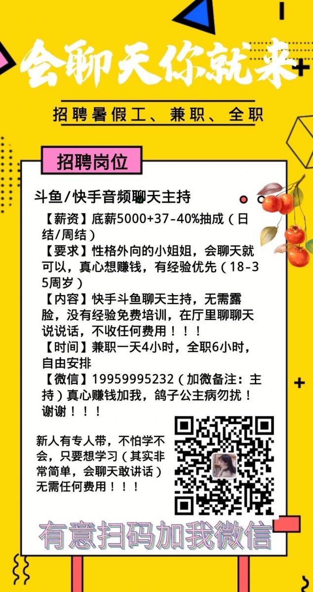 【内容】快手斗鱼聊天主持,无需露脸,没有经验免费培训,在厅里聊聊天说说话,不收任何费用!!!