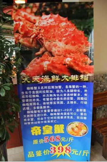 “我们一直很有诚信,顾客也很信任我们,就餐时虽然没有明确告知所吃帝皇蟹的具体重量,但我们餐馆内每个房间都贴的有宣传海报,上面明确写明了每斤帝皇蟹的价格是398元,帝皇蟹每只重量普遍达1到2公斤。”彭梅说,他们的店都是平价消费,和中餐价格差异不大,顾客把消息发到网上后,他们也感觉很冤枉,但是还是愿意和顾客解释帝皇蟹是进口的,价格确实很贵。
