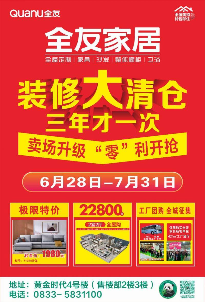 夹江全友家居6月28日—7月31日装修大清仓,三年才一次,疯狂甩卖,零利开抢,精品意式沙发只需1980元,精品皮沙发只需4580元,极限全屋套餐只需22800元,百款样品两折起售,机会不容错过    地址:黄金时代全友家居   抢购电话****