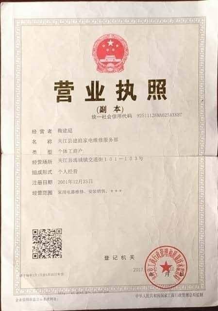 单位名称: 夹江县建庭家电维修服务部