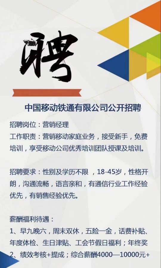 乐山夹江移动公司招聘营销经理,年龄:25一40岁,男女不限,不会可教,工资 ...