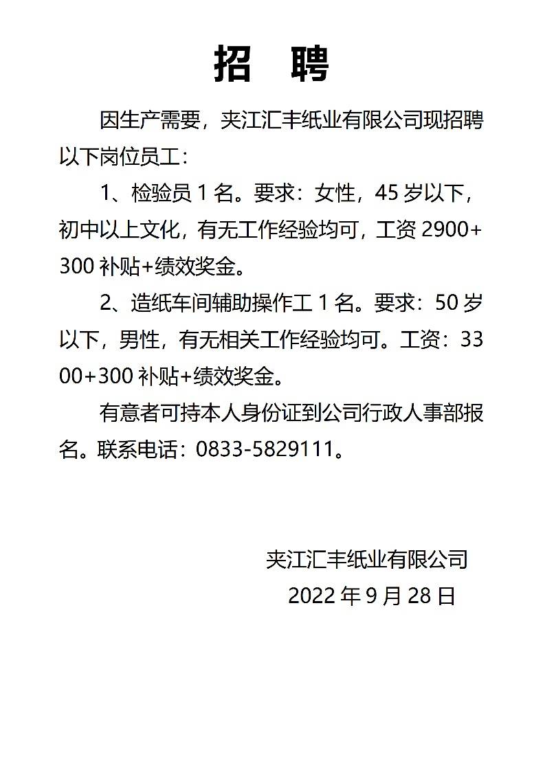 夹江汇丰纸业有限公司现招聘以下岗位员工: 1、检验员1名。要求:女性,45 ...