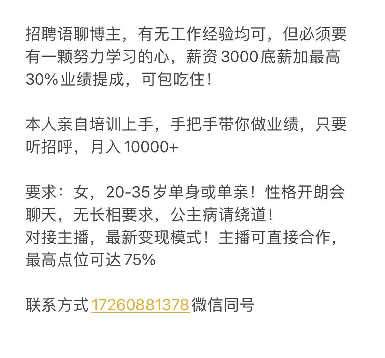 招聘语聊博主,有无工作经验均可,但必须要有一颗努力学习的心,薪资3000底薪加最高30%业绩提成,可包吃住!