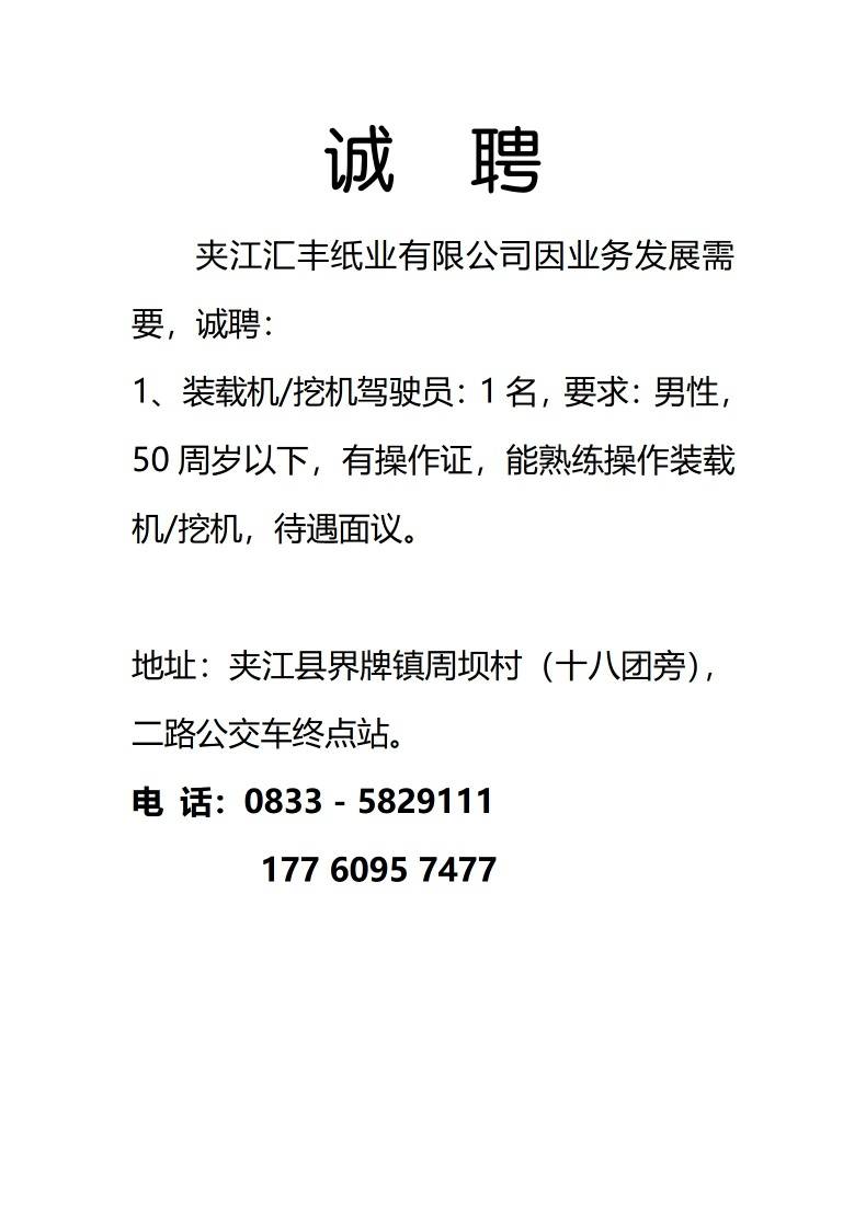 夹江汇丰纸业有限公司因业务发展需要,诚聘: 1、装载机/挖机驾驶员:1名, ...