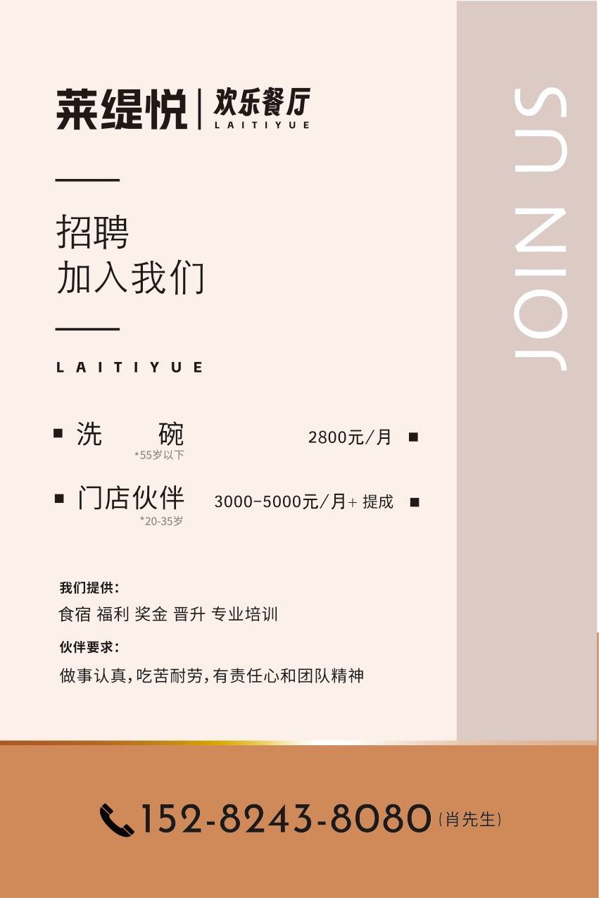 莱缇悦牛排餐厅入驻夹江县,招聘服务员数名,包吃包住,月休4天 薪资待遇: ...