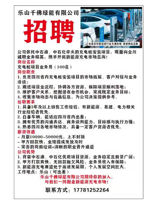 详细描述: 【招聘】乐山新能源科技有限公司招聘充电桩业务经理,现面向全川诚聘业务精英,携手开拓新能源充电市场蓝海!岗位名称充电桩业务经理岗位职责负责四川省内充电桩安装项目的市场拓展、客户对接与业务洽谈任职要求1. 具备团队精神2. 自备车辆3. 拥有正常沟通能力薪资待遇- 月薪10000-20000元,上不封顶-结算周期1周- 完善的岗前培训+清晰的职业晋升通道公司优势1. 业务稳定且前景广阔;2. 业务员收入有保障;3. 新能源充电赛道处于高速发展期,个人发展空间巨大。<br><br>