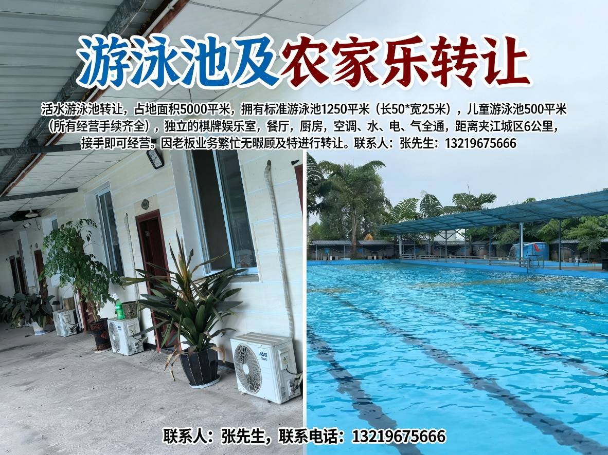 活水游泳池转让,占地面积5000平米,拥有标准游泳池1250平米(长50*宽25米),儿童游泳池500平米(所有经营手续齐全),独立的棋牌娱乐室,餐厅,厨房,空调、水、电、气全通,距离夹江城区6公里,接手即可经营。因老板业务繁忙无暇顾及特进行转让。联系人:张先生,联系电话:****。<br><br>
