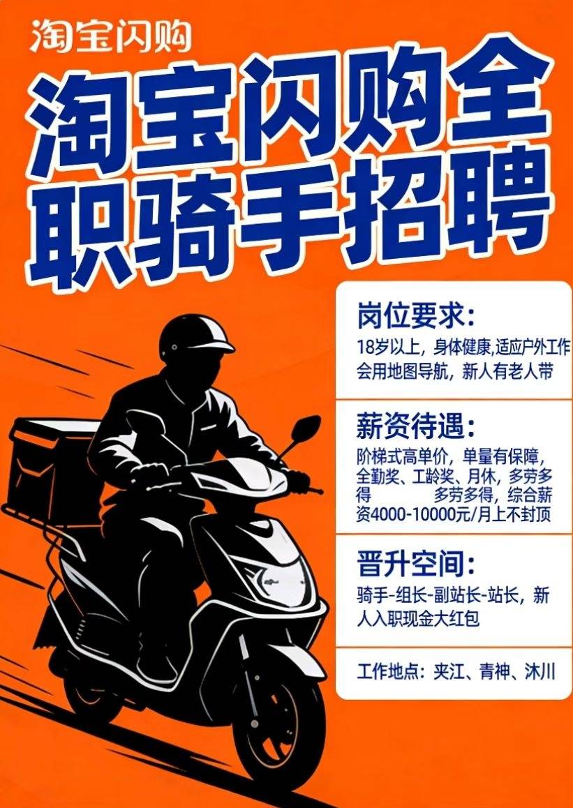 淘宝闪购招聘全职骑手送餐员。 1、年龄18岁以上,身体健康,能适应户外工作 ...